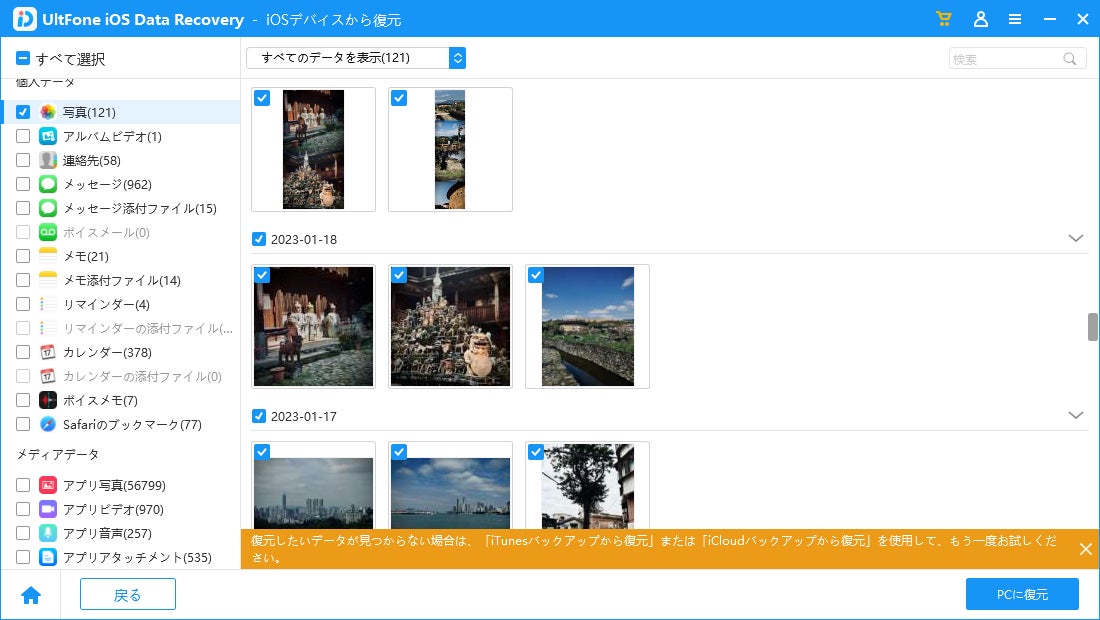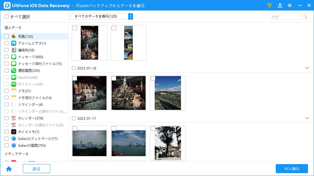 ステップ3:スキャン後、データがプレビュー表示され、目的のデータを選択できます。最後に「PCに復元」ボタンをクリックし、復元したデータをシステムに保存する場所を指定して下さい。