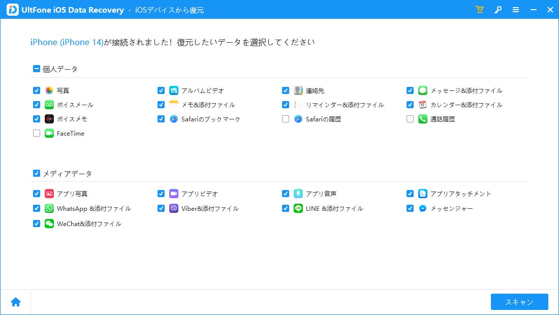 ステップ2:ソフトがデバイスを検出したら、復元したいデータのファイルタイプを選択します。「スキャン」をクリックして、デバイスのスキャンを実行します。