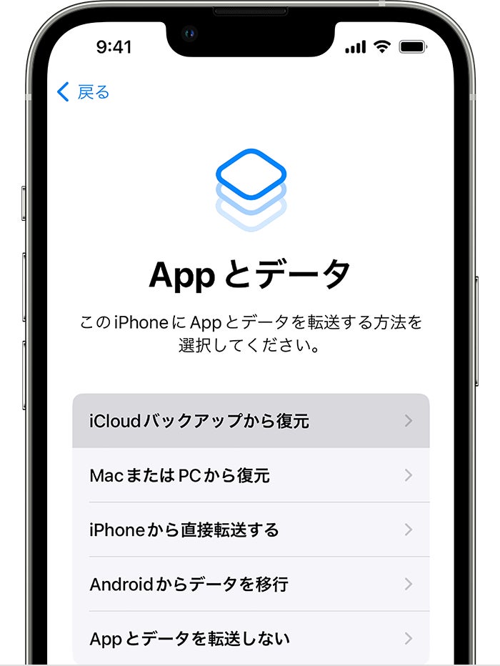 ステップ2:次にデバイスの初期設定を行います。画面に従いセットアップを進め、「アプリとデータ画面」で「iCloudバックアップから復元」をタップします。
