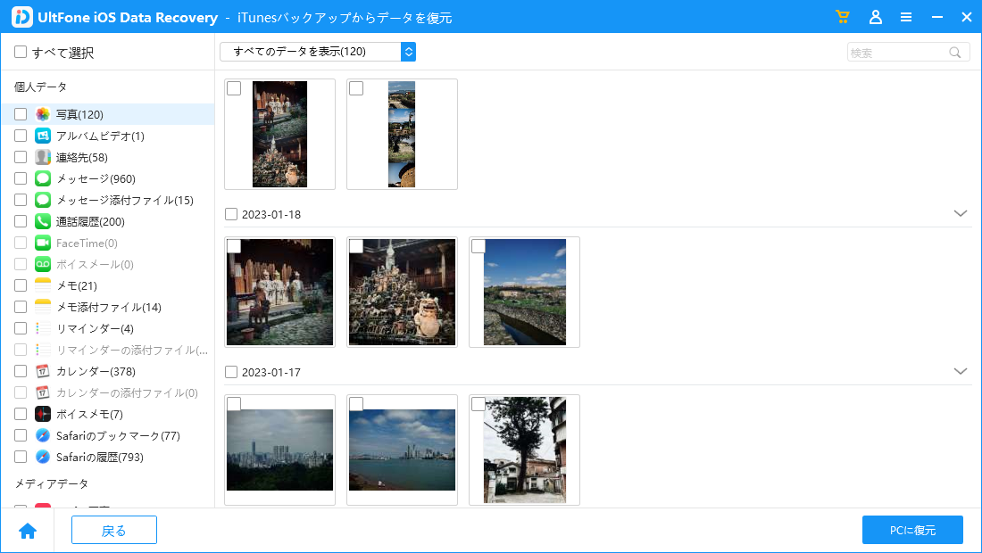 ステップ3:スキャン後、データがプレビュー表示され、目的のデータを選択できます。最後に「PCに復元」ボタンをクリックし、復元したデータをシステムに保存する場所を指定して下さい。