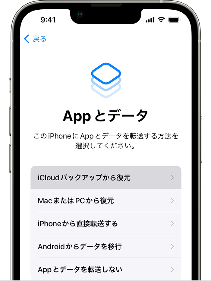 ステップ2:次にデバイスの初期設定を行います。画面に従いセットアップを進め、「アプリとデータ画面」で「iCloudバックアップから復元」をタップします。