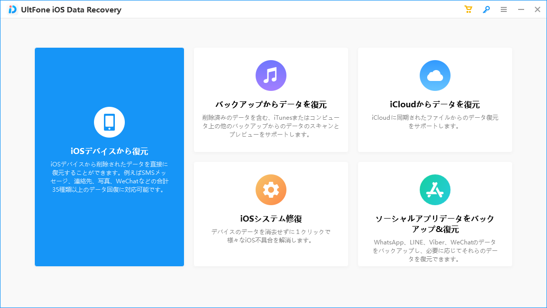 ステップ1:UltFone iOS Data Recoveryを入手後、起動します。iPhoneとPCをケーブルで接続して、メインインターフェイスの「iOSデバイスから復元」を選択します。