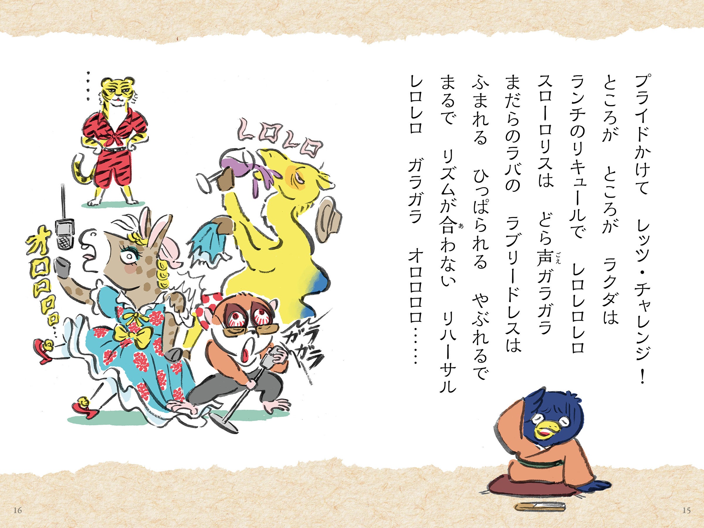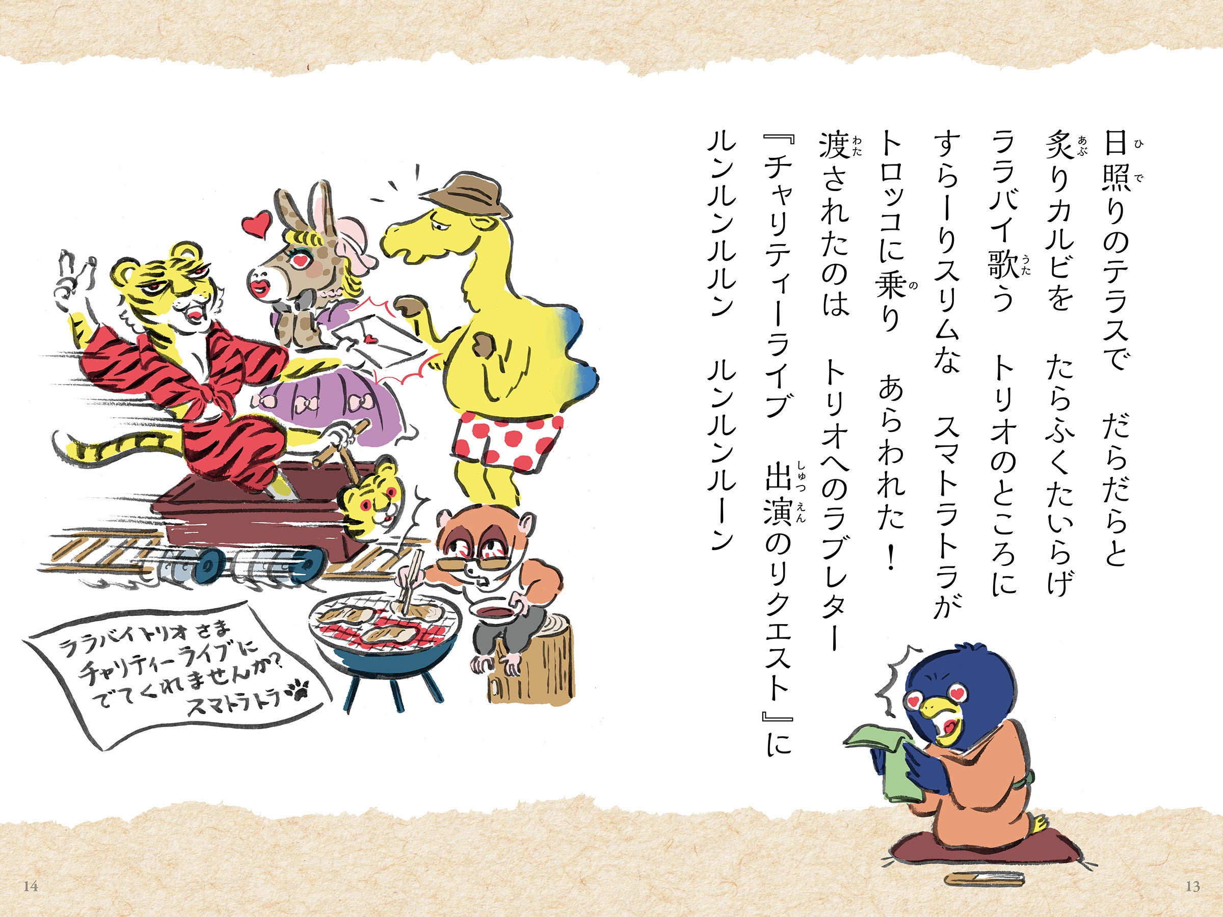 ラクダ、ラバ、スローロリス、スマトラトラが登場し、動物好きのお子さんも楽しめるうえ、これまでの作品に出てきたキャラクターが再登場するなど、今回もユーモアあふれる絵本に仕上がりました。