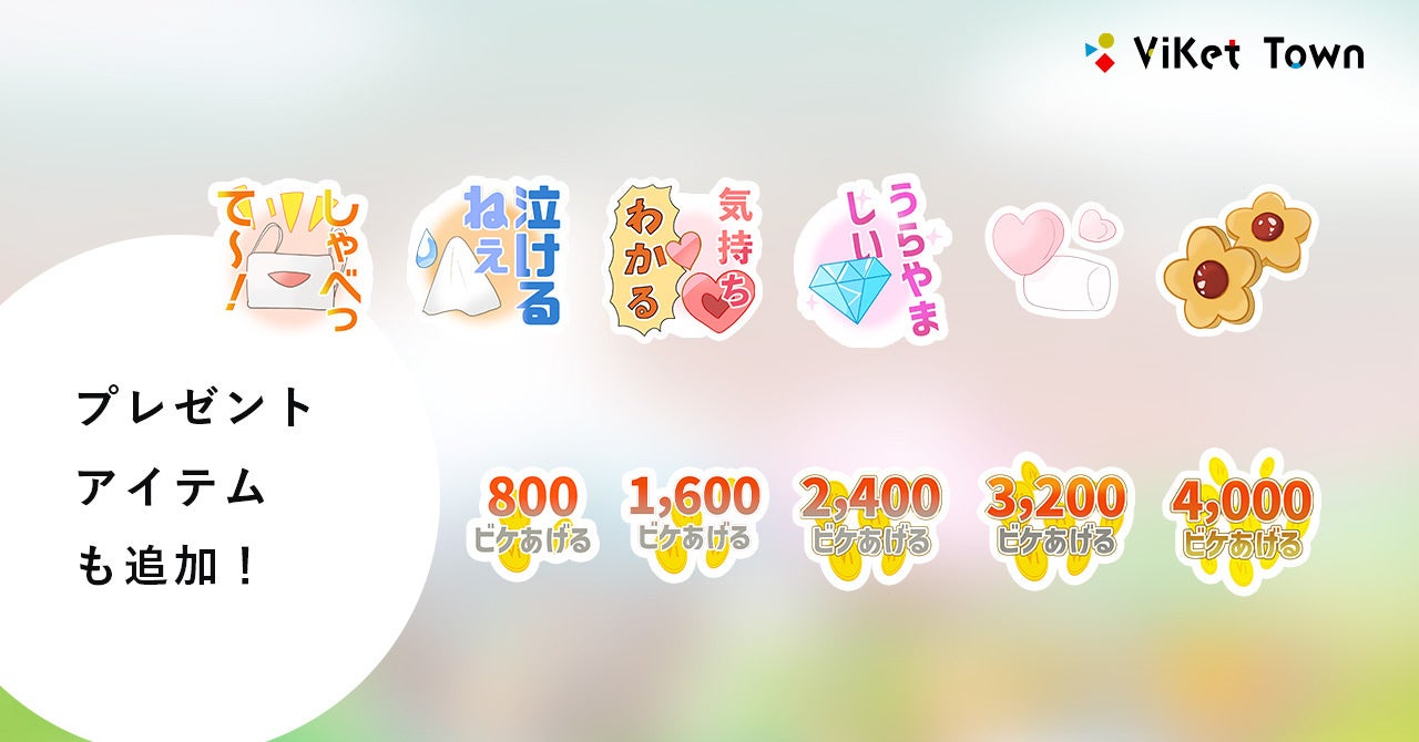 ViKet Townではプレゼントやメッセージ付きアイテムも毎月更新中。今月もコミュニケーションを促すスタンプや、ホワイトデーにちなんだマシュマロなどをリリース。また、活躍しているメンバーにビケをプレゼントできるアイテムも追加。