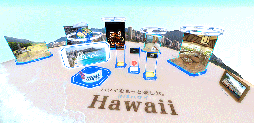 旅の魅力をお伝えするためにメタバース上に立ち上げたバーチャル支店です。アバターで「ハワイ」「沖縄」「ハウステンボス」に訪れた気分が味わえるフォトスポットをたくさんご用意して、皆様のご来店をお待ちしております。