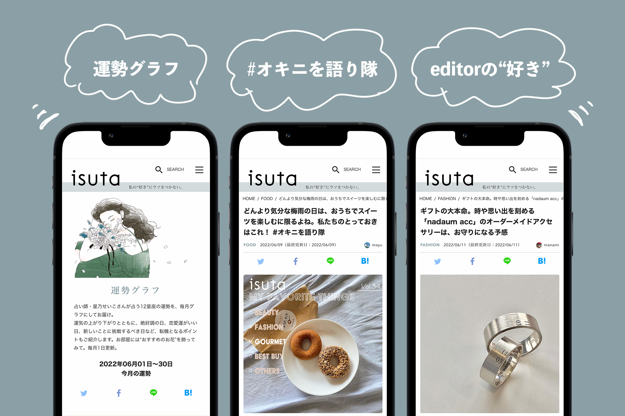 isutaでは、「私の“好き”にウソをつかない。」をコンセプトに、今後も編集部が本気でときめいた温もりのある情報を配信予定。SNSで密かに注目されているスポットや、良質なアイテムを展開するファッションブランド、充実したおうちでの過ごし方など、新たな「好き」が見つかるコンテンツを配信し、読者にポジティブな行動をもたらすメディアを目指してまいります。