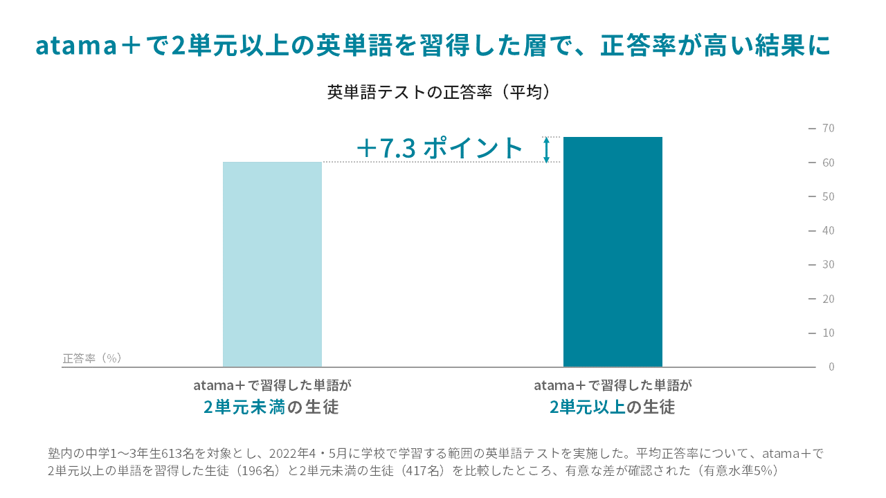 中学生を対象にした英単語テストにおいて、atama+で2単元以上の単語を習得した生徒の平均正答率は、2単元未満の生徒と比較して7.3%ポイント上回る結果となりました。また、生徒の学力層別に比較しても全ての層において正答率が向上していることが確認できました。生徒のアンケートでは「楽に単語を覚えられる」「間違えたところを繰り返し勉強でき、発音やスペルが正確にわかる」といったポジティブな感想を得られました。