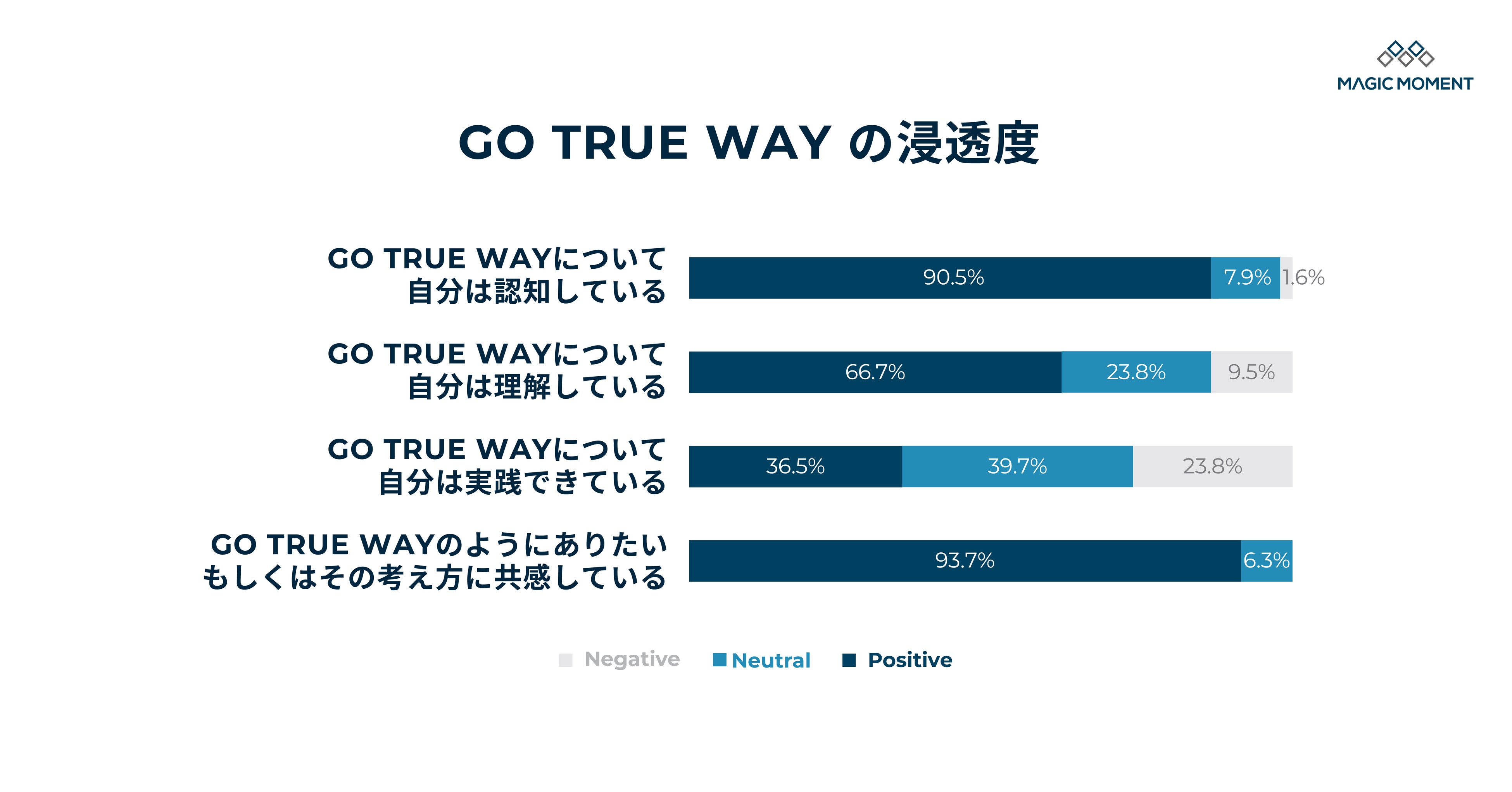 GO TRUE WAY の浸透度は認知・理解・実践、そして共感という点で測定。当社における意思決定の基準として、重要な指針でありカルチャーを代表するものとして浸透度を測りました。