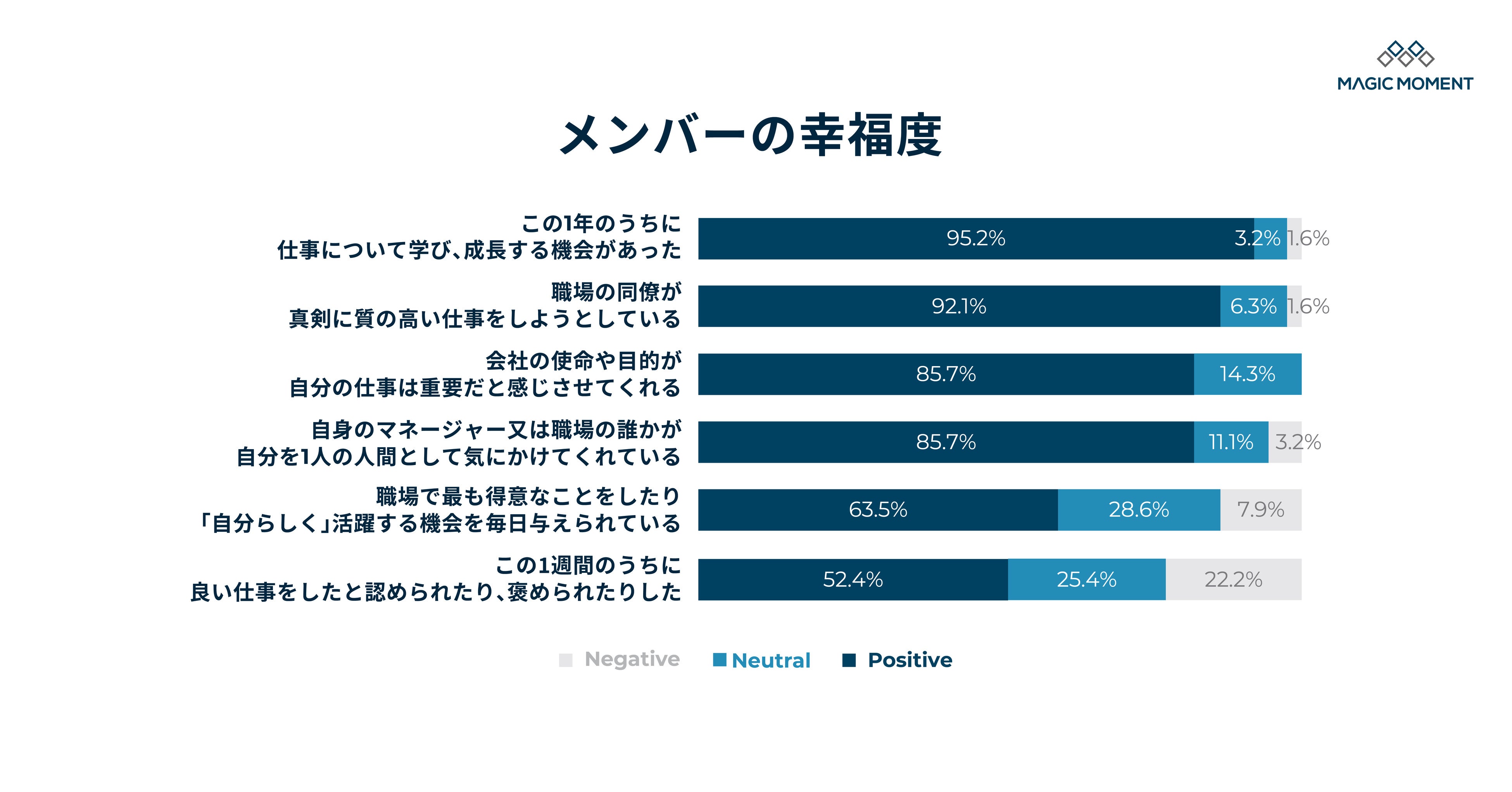 「メンバー間の信頼感」と「1年以内の成長実感」について90%超、「当社で働く意義」や「個の尊重」についても85%超のメンバーが、Positive と評価しています。一方で、「得意なことなど自分を生かすことができる」「1週間以内の仕事における Recognition 」という点は、それぞれ Positive が 63.5%、52.4%となりました。