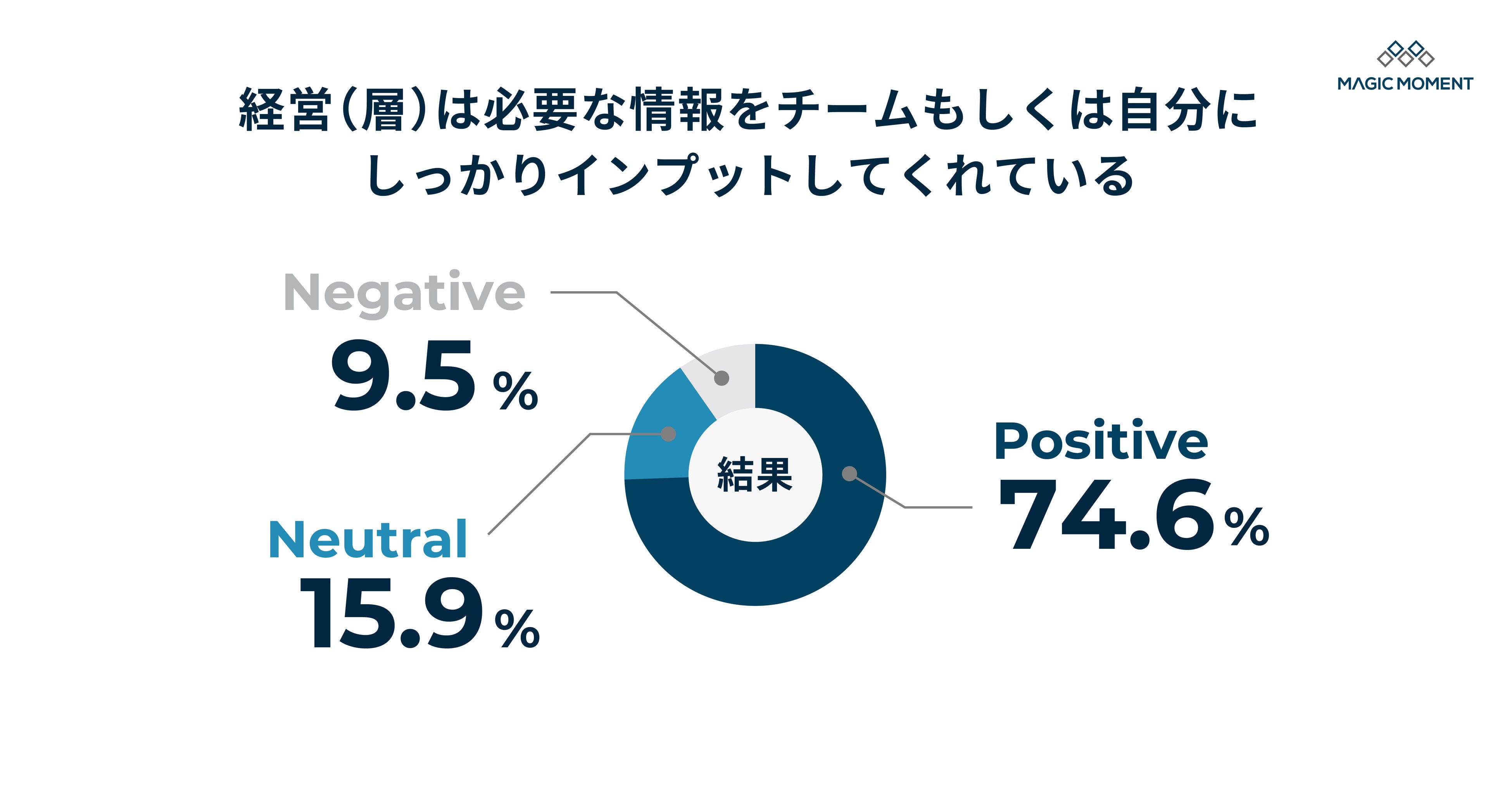 比較的高い割合で十分な情報共有ができていると認識しましたが、その一方で4分の1のメンバーが Neutral または Negative としている点は憂慮すべき事項と捉えています。自由回答を分析した結果、経営に求める情報としては「社会や顧客にとって自社がどんな存在でありたいか」「組織としての展望、その中で個人に期待されていること」などが多く、所属チームや企業としての正しい発展を常に探求するメンバーの姿勢が伺えました。同時に、環境変化に伴って実施している経営の意思決定に関する情報発信もきめ細やかに行なっていきます。