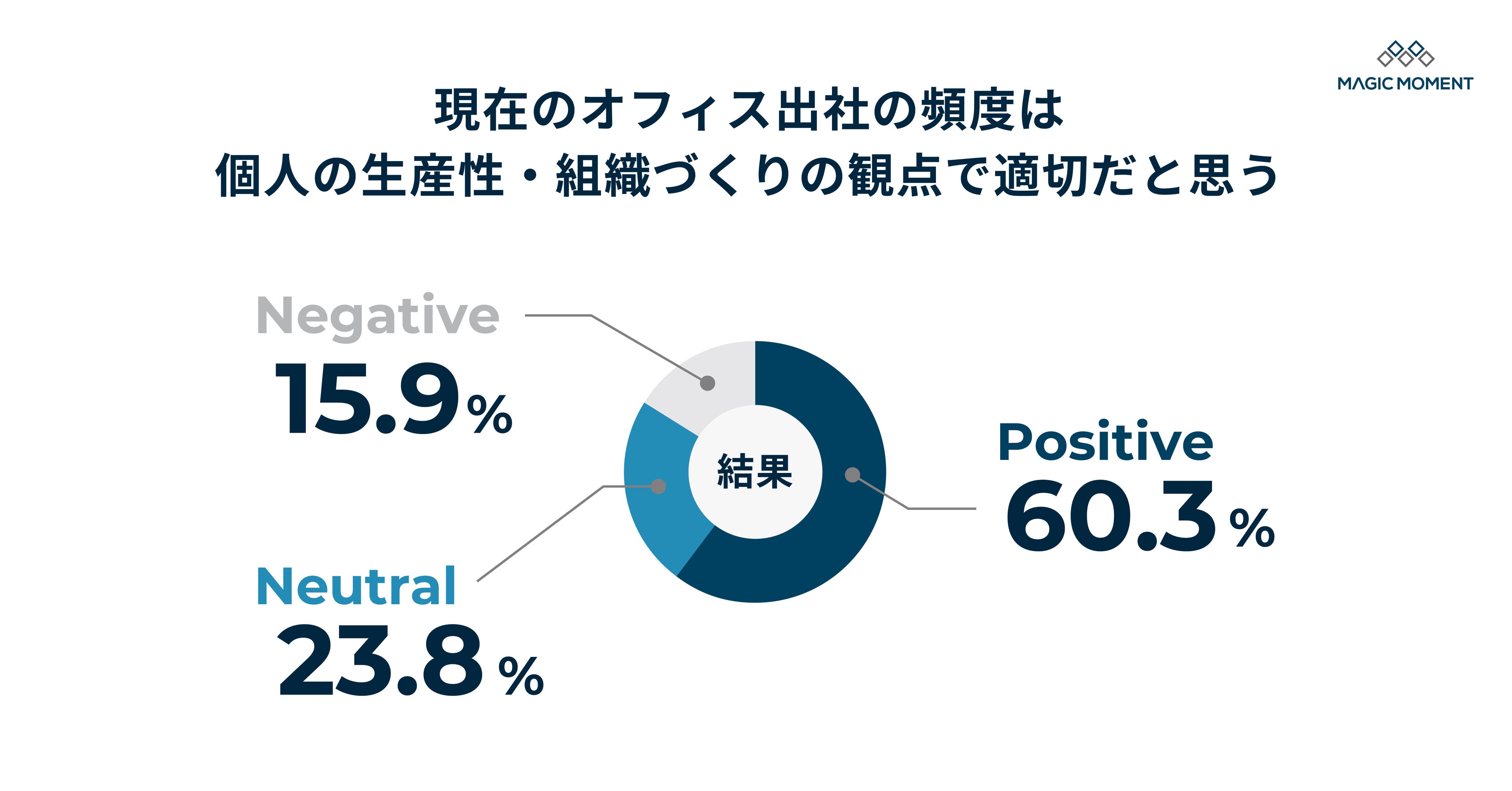 現在のオフィス出社のレギュレーション(原則週3日をオフィス出社、ただし業務・職種により調整可)の妥当性については、Positive 60.3%、Neutral 23.8%、Negative 15.9% という結果となりました。役割毎で対応を個別化していたことで比較的多くの支持を得られた一方で、約3割のメンバーが判断がつかないといった状況であることが分かりました。