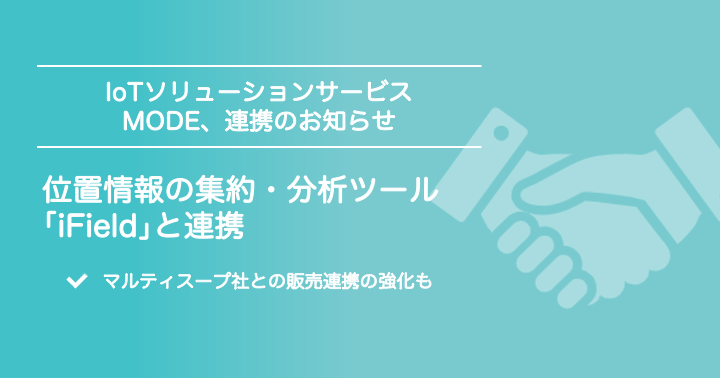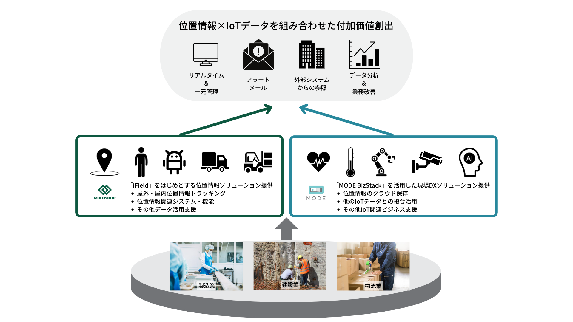 この度、マルティスープが提供する「iField」をMODEと連携させることで、収集した位置情報をクラウドに長期保存、機器や作業者の稼働データ・健康データなどMODEが扱う様々なIoTデータと掛け合わせた活用が可能となります。また両社がシステムを相互に融合させて提供することで、販売提携の強化を目指します。