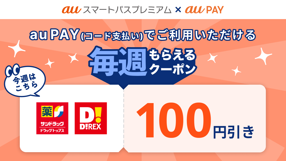 全国の「サンドラッグ」、「ダイレックス」において、au PAYで101円以上のお支払いに使える100円割引クーポンをプレゼントします。