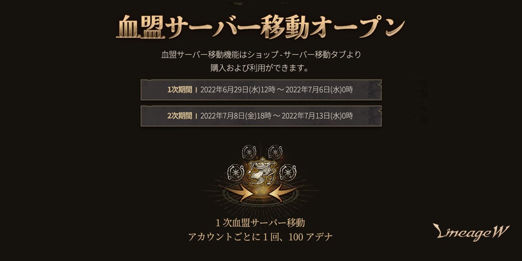 「血盟サーバー移動」とは、血盟名や血盟経験値、貢献順位情報といった血盟情報を維持した状態で、他のサーバーへ移動できるサービスです。