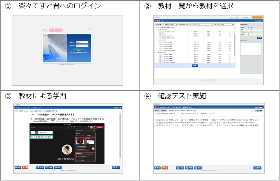※2 eラーニングシステムには、株式会社アグレックス「楽々てすと君」を使用しています。「楽々てすと君」は、累計460社超のお客様に採用されている教育・テスト・アンケートが1つになったクラウド型eラーニングシステムです。(https://www.agrex.co.jp/service/detail/testkun.html)