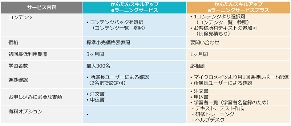 以下、標準小売価格表は、1ヶ月分の利用料金です。「かんたんスキルアップ」の最低利用期間は3ヶ月です。