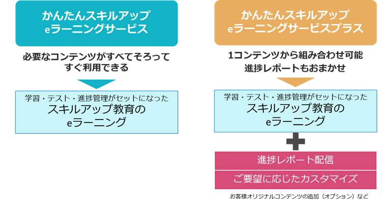 「かんたんスキルアップ」「かんたんスキルアッププラス」は、マイクロメイツの企業研修のノウハウをもとに開発した、学習・テスト・進捗管理がセットになったeラーニングサービス※2です。「かんたんスキルアッププラス」には、進捗レポート配信サービスが付属されており、学習管理者の進捗管理にかかる負担を軽減します。また、お客様独自のコンテンツをeラーニングに追加するなど、各種有料オプションの利用も可能です。