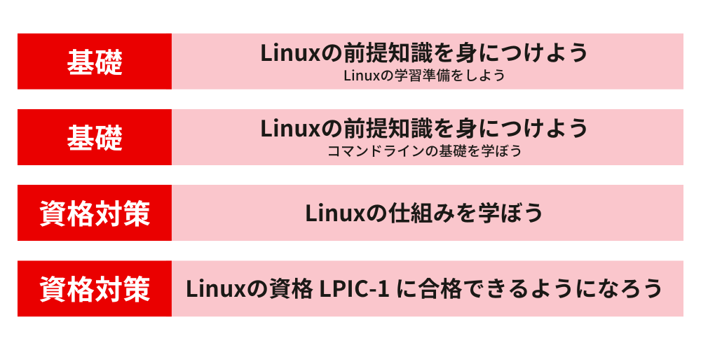 本コースは、以下の4Stepで構成されています。Stepごとに学習内容が分かれているため、何を学びたいかチェックしましょう。本コースを学習すれば、Linuxの使い方から仕組みまでを習得できます。