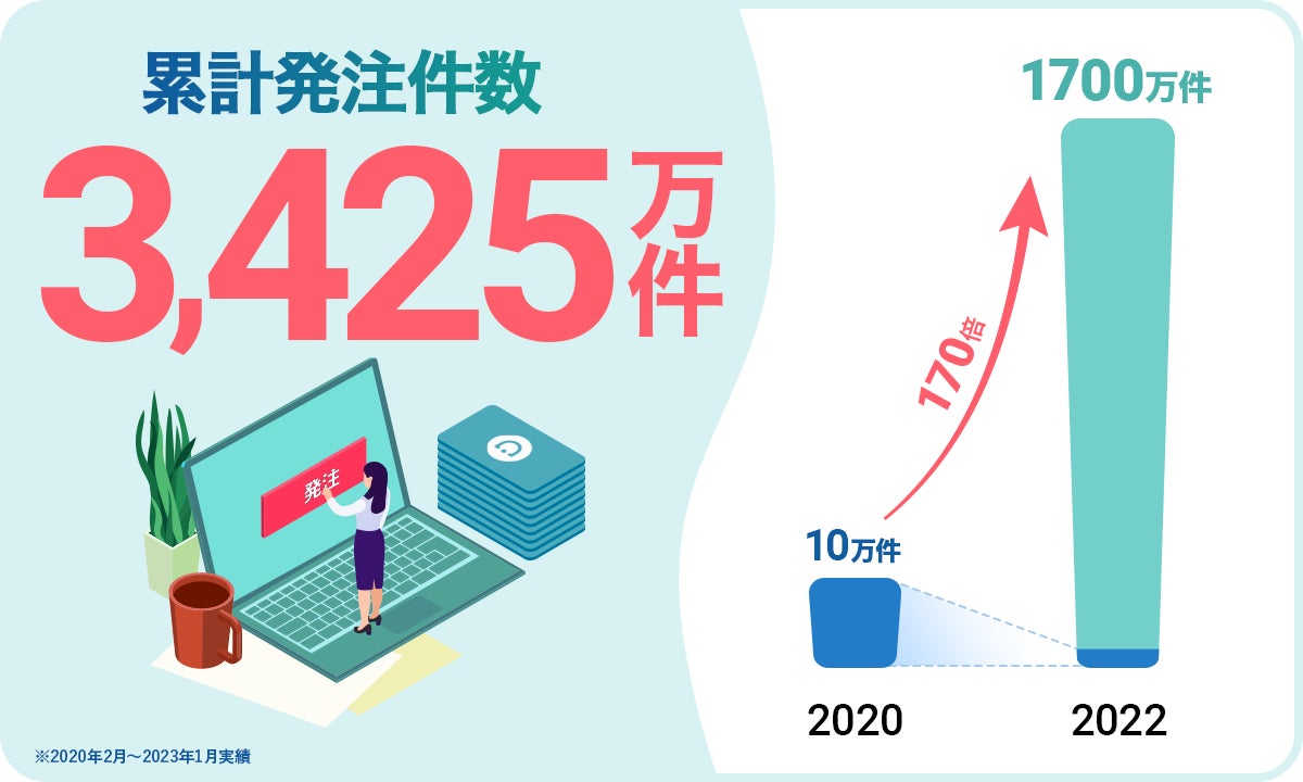約3年間の累計発注件数は3,425万件以上となりました。年間の発注件数では、2020年の約10万件に対し、2022年は約1,700万件と約170倍まで好調に伸び続けてまいりました。一度ご導入いただいた企業にご好評をいただき、別の施策においても継続してご利用いただくケースも多くございます。