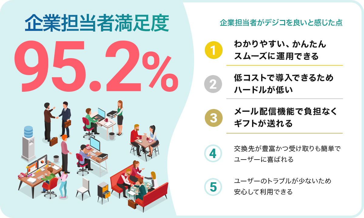 「デジコ」をご導入いただいている企業担当者に対するアンケート調査を行ったところ、企業担当者の満足度(※)は95.2%でした。また、企業担当者が「デジコ」を満足と感じた理由は以下の通りでした。