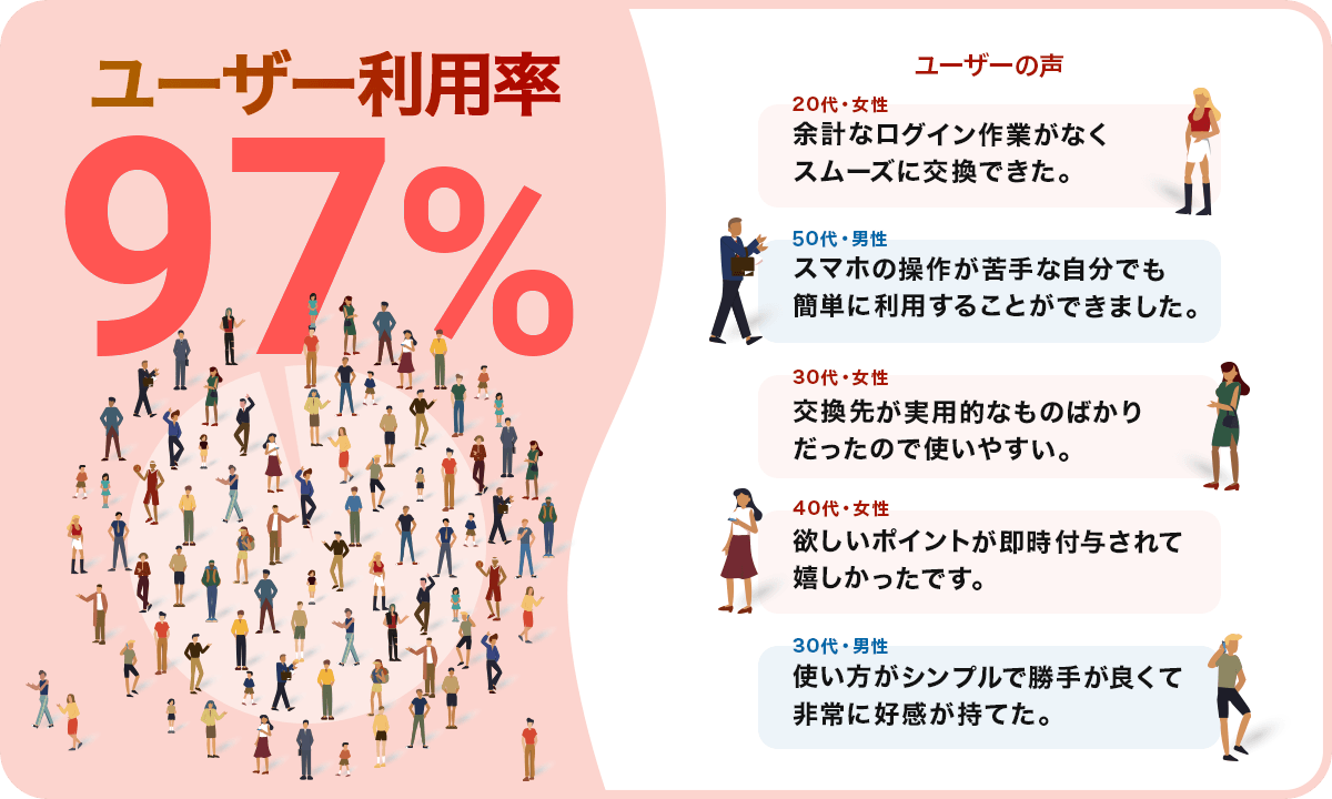 直近3ヶ月の調査で、企業から「デジコ」を受け取った全てのユーザーのうち交換先へと交換完了した割合を示すユーザー利用率は97%と非常に高く、ユーザーからの満足の声も多数いただきました。老若男女問わず幅広いユーザーに喜ばれ、きちんとご利用いただける点が大変ご好評をいただいております。