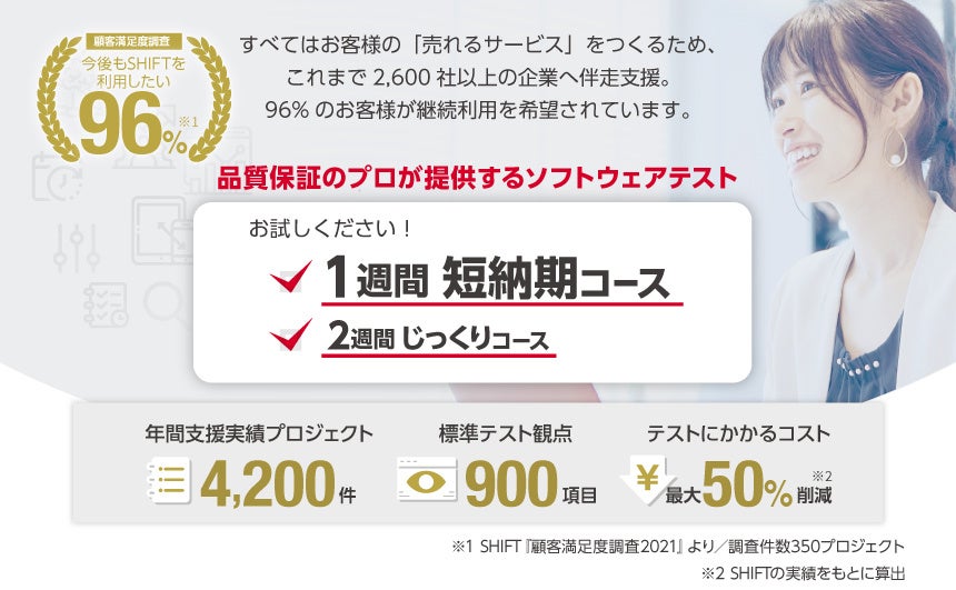 ソフトウェア品質保証の専門企業である株式会社SHIFTは、96%の顧客満足度*を誇るソフトウェアテストで、品質課題を短期に解決する「1週間 短納期コース」「2週間 じっくりコース」をご用意いたしました。