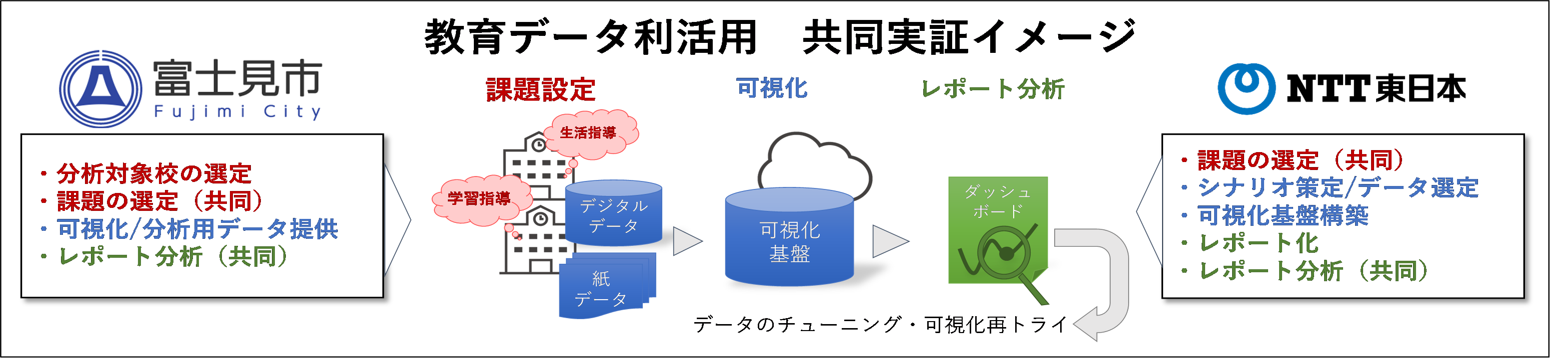 富士見市(市長:星野 光弘)と東日本電信電話株式会社 埼玉事業部(事業部長:市川 泰吾、以下「NTT東日本」)は、2021年5月13日に締結した多分野連携に関する協定※1(以下「本協定」)に基づき、富士見市教育委員会が保有する教育データを活用した共同実証を実施いたします。