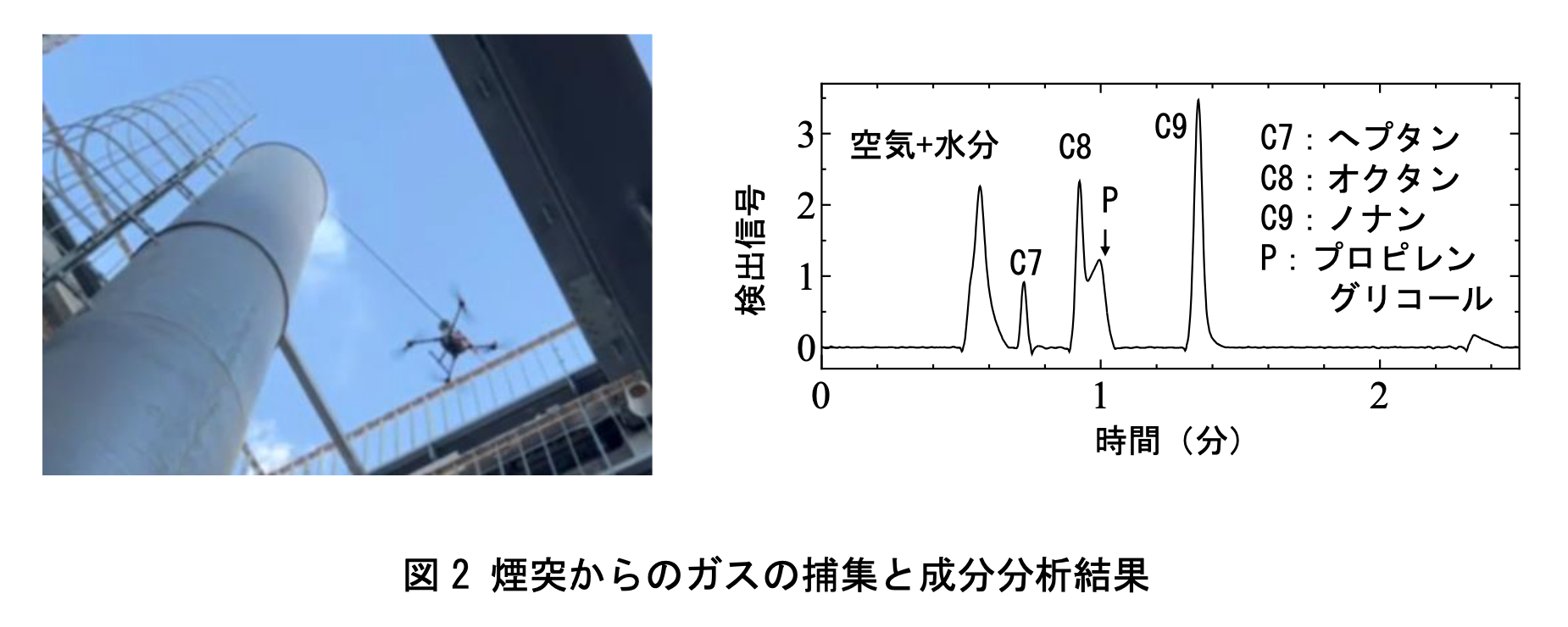 最初の適用試験として、イノベ機構 RTFの試験用プラントにおいて、この装置のプラント管理への適用性を検証しました。煙突から放出される試験用ガスを30秒間捕集して分析した結果、石油を燃焼するプラントで通常観測されるヘプタン(C7)、オクタン(C8)、ノナン(C9)を捕集時間も含めて3分という短時間で分析できました(図2)。別途行ったセンサの校正によると、捕集中のノナン(C9)の平均濃度は17ppmv(100万分の17)でした。検出信号のノイズが小さいことから、飛行中の局所的なガスの捕集という難しい条件のもとで、検出下限1 ppmv以下という高感度な分析ができました。これには、ドローンの高精度な制御によりサンプリング機構を煙突先端に安定して保持できた効果も寄与しています。