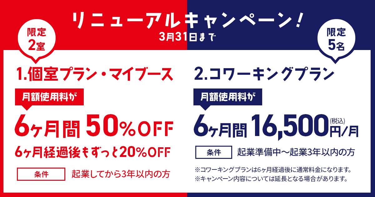 コワーキングの月額使用料が6ヶ月間 16,500円(税込)/月に割引。(通常料金:29,700円/月)