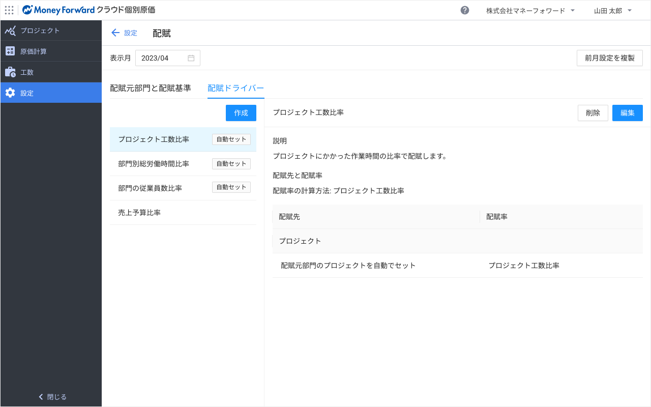 自社の運用に合わせて勘定科目ごとに配賦基準の設定が可能です。プロジェクト工数や労働時間などから自動で配賦比率を算出して間接費の配賦計算を行います。