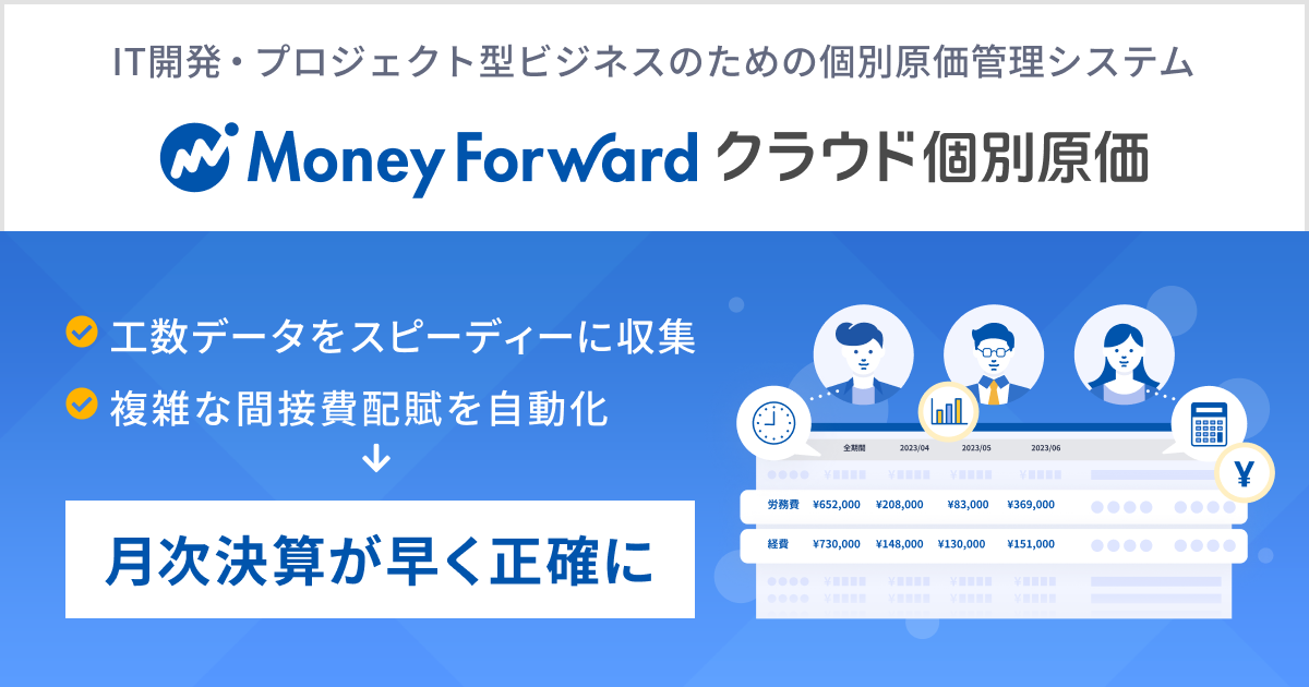『マネーフォワード クラウド個別原価』(https://biz.moneyforward.com/project-cost/)は、プロジェクトの工数管理から個別原価計算までの原価管理業務をトータルでサポートする個別原価管理システムです。個別原価計算を行うために必要なプロジェクトの工数データをスピーディーかつ正確に収集できるだけでなく、間接費配賦の自動化により、月次決算を効率化します。また、リアルタイムで最新の原価情報を把握できるため、経営判断を迅速に行うことができます。