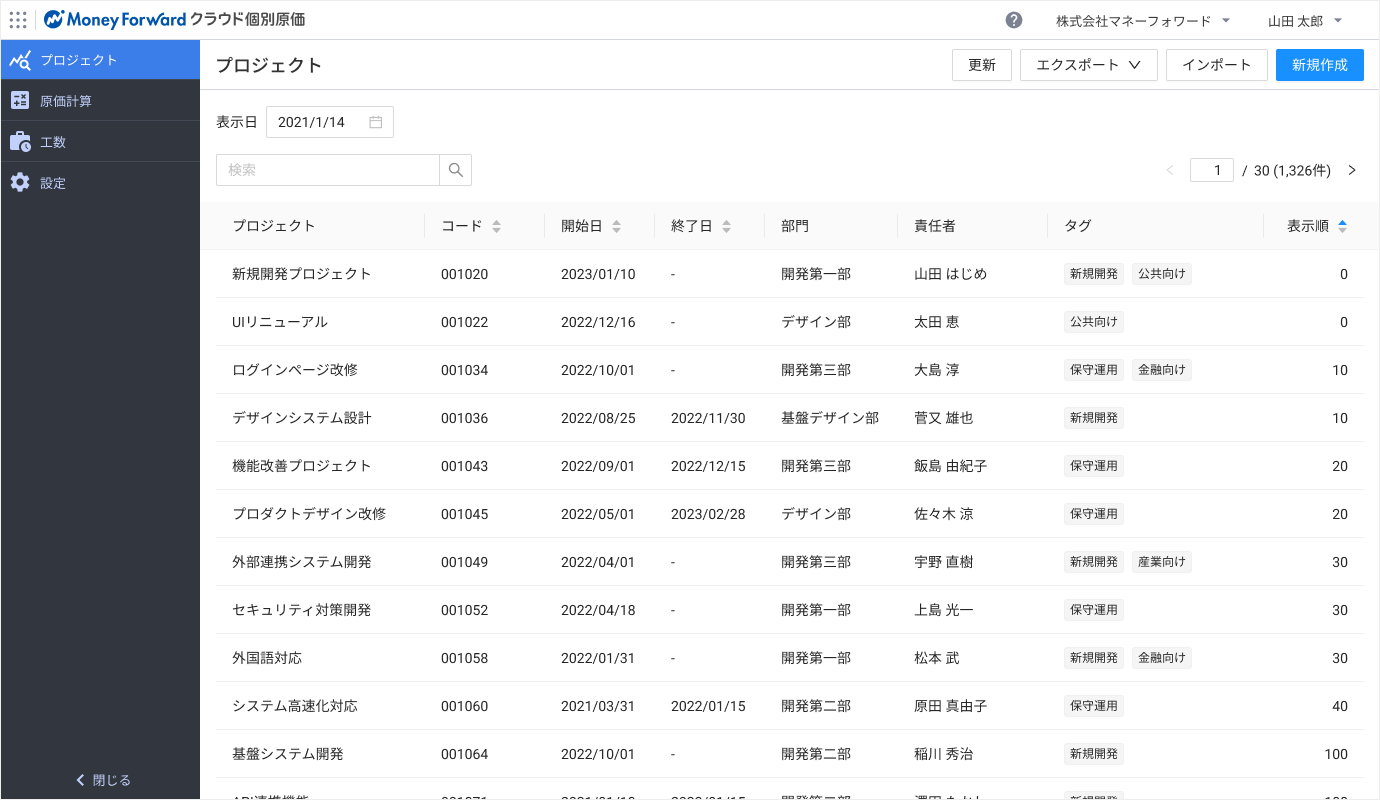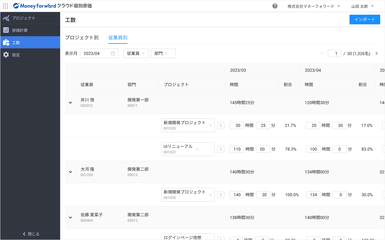 『マネーフォワード クラウド個別原価』は、プロジェクトの工数管理から個別原価計算までの一連の原価管理業務をトータルでサポートし、最新原価を可視化できる個別原価管理システムです。 『マネーフォワード クラウド会計Plus』や、他社サービスとのAPI連携によりデータを自動収集できる他、一括インポートにも対応しています。