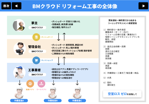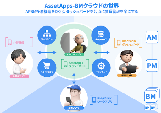 PM-BM業務遂行をクラウド化し、部分最適ではなくBM全体の業務フロー一元化を通じた構造最適化を目指した業者アプリ機能を通じてPM会社の競争力向上を支援します。