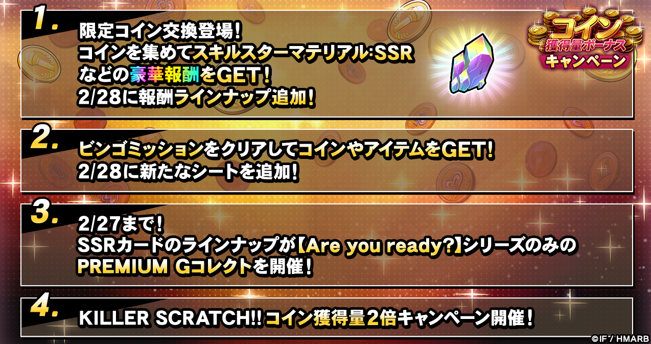 「スキルスターマテリアル:SSR」など豪華アイテムと交換できる限定コイン交換をはじめ、ビンゴミッションやログインボーナス、KILLER SCRATCH!!をプレイした際のコイン獲得量が2倍になるキャンペーンなどを開催しています。詳細はアプリ内お知らせをご確認ください。