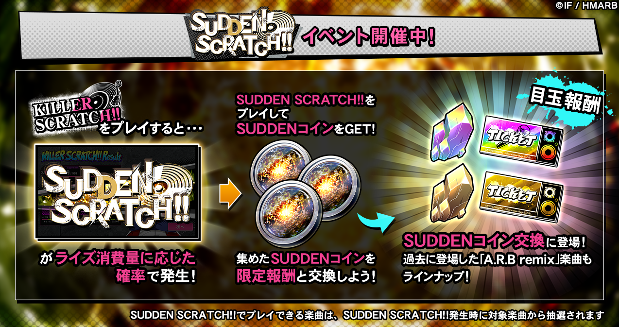イベント期間中、KILLER SCRATCH!!をプレイするとライズ消費量に応じた確率でSUDDEN SCRATCH!!が発生します。SUDDEN SCRATCH!!をプレイすると、通常の報酬アイテムの他、限定アイテム「SUDDENコイン」を獲得することができます。「SUDDENコイン」を集めることで、「Gコレクトチケット:SSR確定」やこれまでに登場した「A.R.B remix」楽曲と交換することが可能です。詳細はアプリ内お知らせをご確認ください。