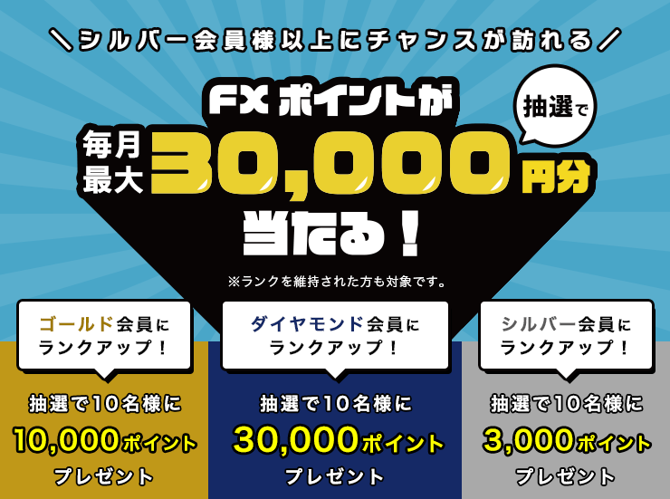 ダイヤモンド、ゴールド、シルバー会員へそれぞれランクアップされた方、または前月から各ランクを維持された方を対象に、抽選で各ランク10名様ずつ最大30,000ポイントをプレゼントいたします。