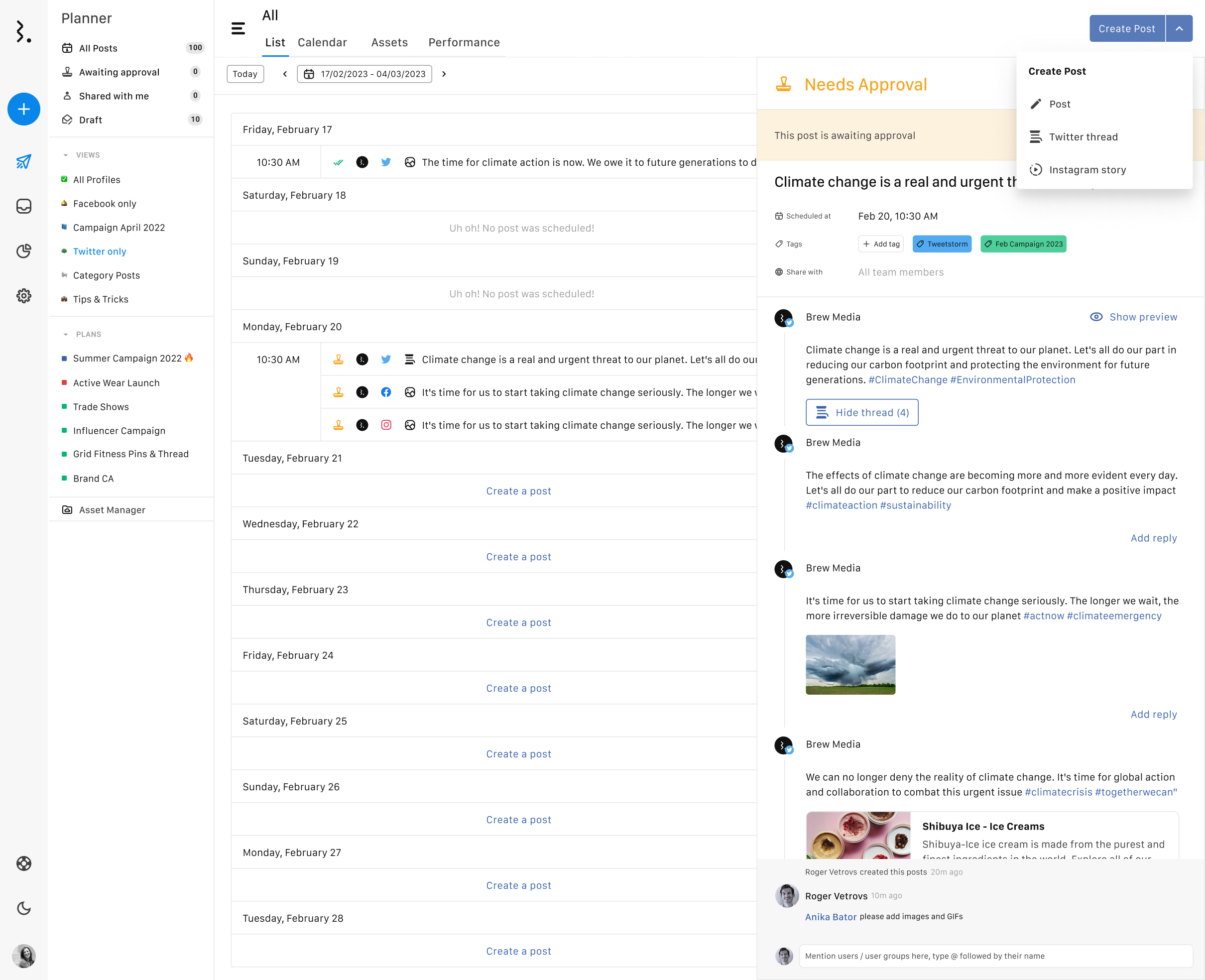 Twitterツリー投稿専用のコンポーズを今回実装し、+ドロップダウンメニューから追加ツイートを好みのツイート分作成、編集することができます。ここで予約時間とともに承認ワークフローを選択すると、本ツリー投稿が一斉に承認チームに通知されます。