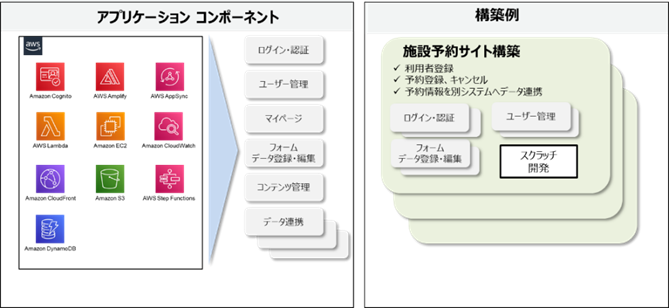 本サービスは、当社で保有するAWSに対応したアプリケーションの部品群(予め必要機能に特化し実装された小粒のアプリケーションを集めたもの)がそろっています。(以下、標準アセット)標準アセット内にあるユーザー認証、メール問合せ、データ登録・編集など、必要となる機能を選択しそのまま適用もしくは必要に応じてカスタマイズできます。そのためパッケージの導入だけで短時間かつ多くのコストをかけずにシステム構築ができるようになります。