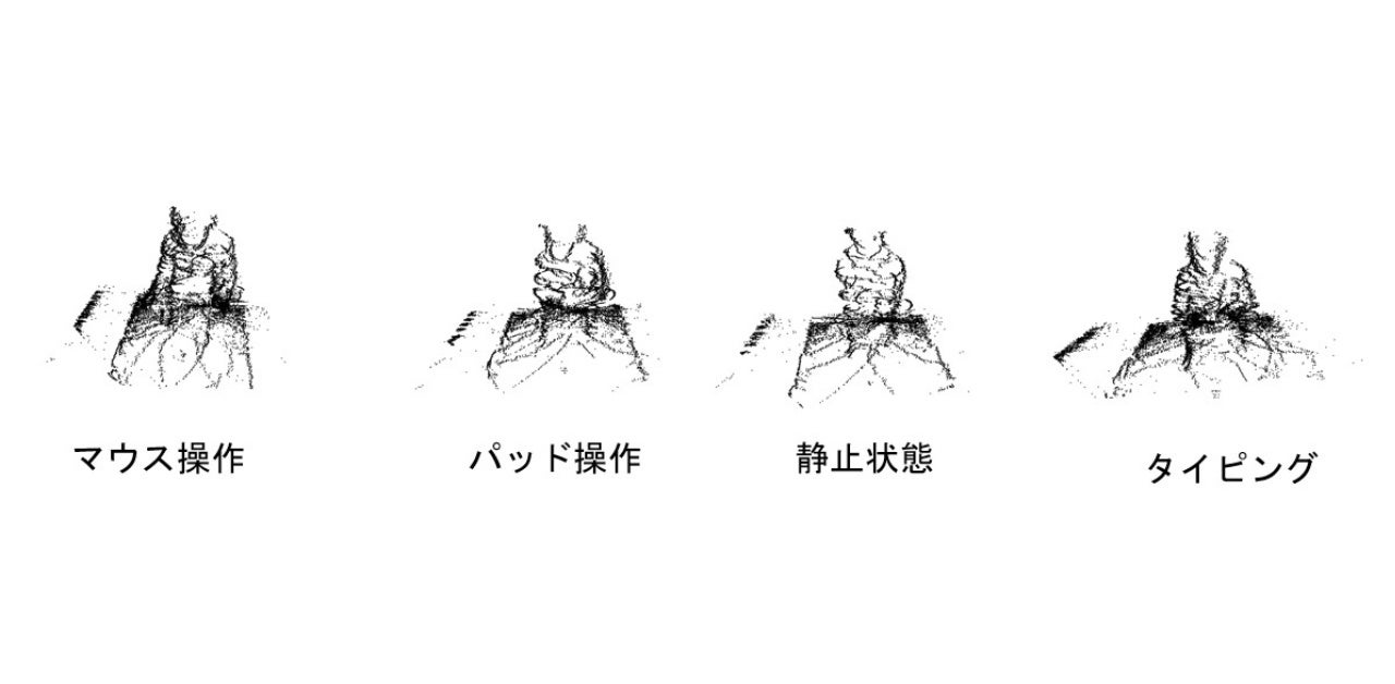 センサとしてLiDARを用い、3次元データから作業中の人の状態を自動検知する深層学習AIのシステムを開発しました。シナリオとしてノートパソコンを用いた作業を想定し、コンテンツ閲覧中/マウス操作中/キーボードタイピング中/タッチパッド操作中の4状態を深層学習AIに自動検知させ、97%の精度を達成しました。実験では、小型(9.7cmX6.4cmX6.3cm)で安価なLIDARセンサ2機を用いました。LiDARのデータはレーザーが物体で反射した空間座標の集合(点群データと呼ばれる)であり、カメラ画像データと形式が大きく異なります。