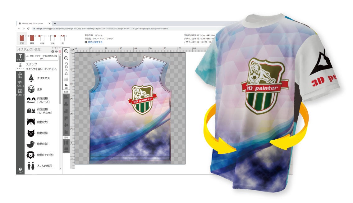 企業様や店舗様向けのグッズ制作、個人様向けのTシャツやトートバッグ、マグカップなどのオリジナルグッズ制作を展開している企業様の多くにご利用いただいている、商品の印刷・柄入れ・名入れのデザインをWeb上で行うことができるデザインシミュレーターです。