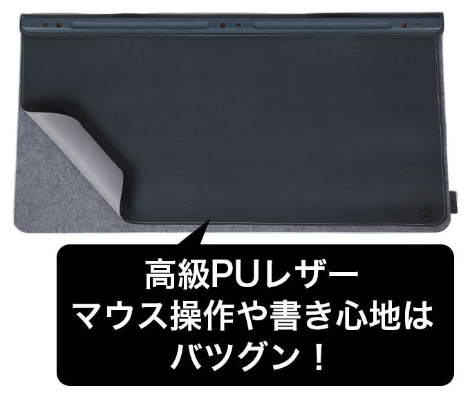 このマットの上に重ねるのが、滑らかな高級PUレザーマットです。PUレザーマットなら、スムーズなマウス操作はもちろん、紙にペンを走らせることもできます。