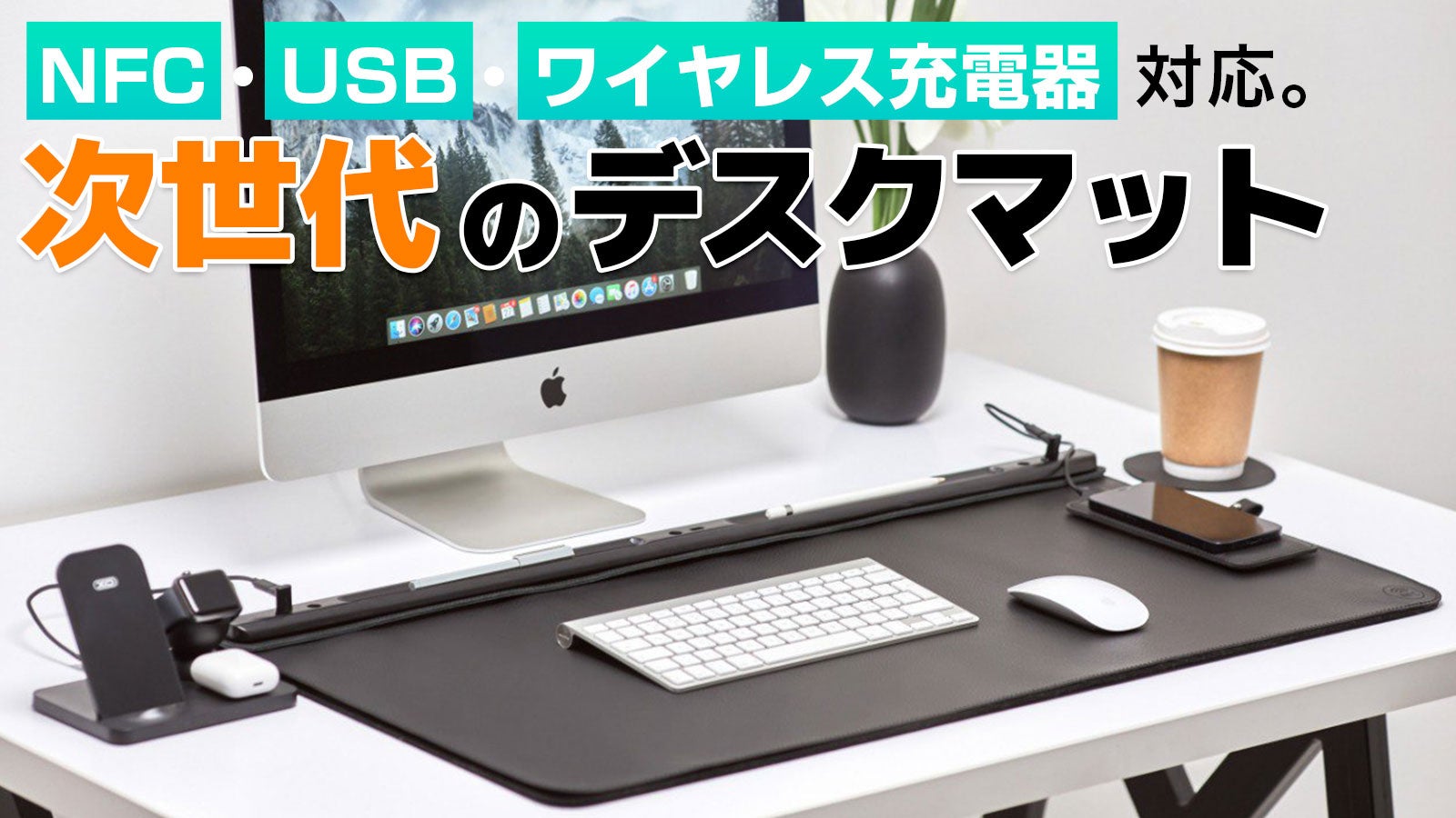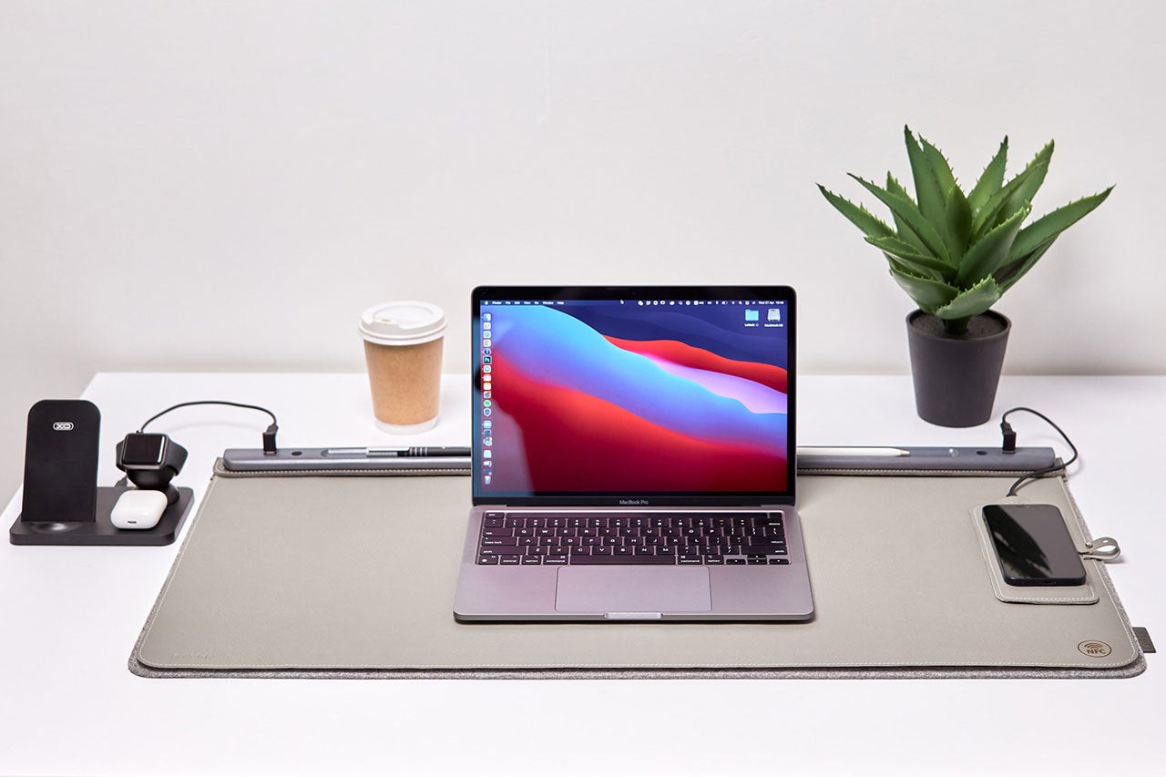 PUレザーマットの左右両側のマグネットに、充電器を固定できます。充電器はQi充電規格なので、iPhoneやAirPodsはもちろん、ほとんどのデバイスに対応しています。充電器は、マットから取り外して持ち運ぶこともできます。