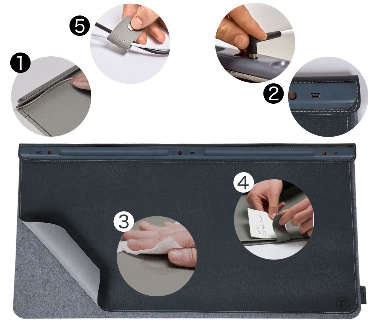 PUレザーマットには、NFCホットスポットが組み込まれています。スマホをピッとタッチすれば、セットされたアプリが自動で開き、ルーティーンにしているスマホアプリ起動可能です。(音楽を聴く、お部屋の電源をON、OFF、アラームを鳴らすなど)