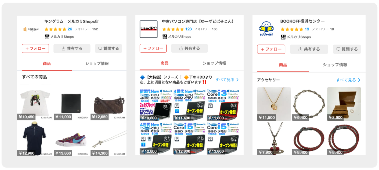 「メルカリShops」内でリユース品が活発に取引される理由として、元々「メルカリ」がリユース品の取引市場であり、「誰かの手に一度渡ったモノでもよいのでお得に購入したい」という利用者が多くいることが挙げられます。また、多くの「メルカリ」利用者は出品で得た売上金を使って商品を購入するため、比較的高単価でも取引が成立するケースがあります。さらに、「フリマアプリで個人からリユース品を購入するのは不安」という利用者に対しても、事業者からリユース品を購入するのであれば安全・安心であるという心理面のメリットも挙げられます。