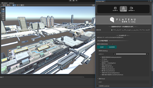 - シーンに取り込んだ3D都市モデルの外観を調整(地物形状のLOD設定、地物タイプの表示・非表示など)