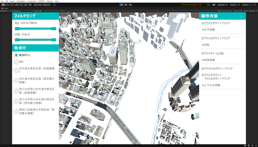 - 直感的なCityGMLインポート(PLATEAUの3D都市モデル標準製品仕様・第2版に準拠した3D都市モデルデータをUnityのシーンへインポート)
