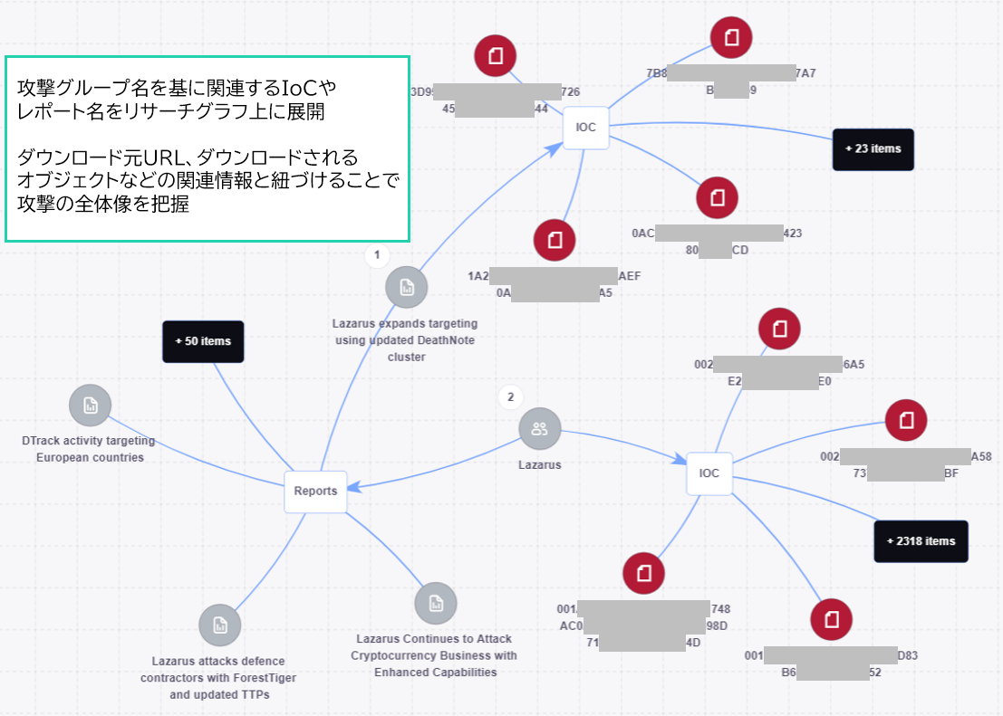 図3:攻撃グループ名「Lazarus」を検索対象にしたリサーチグラフの展開例