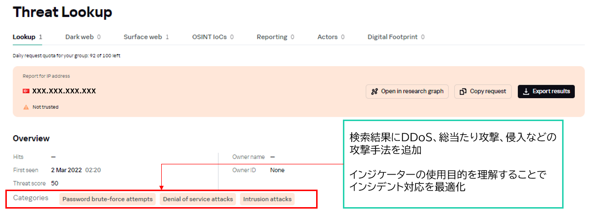 これまでのIPアドレス、URLやオブジェクトの白黒判定の検索結果に、DDoS、侵入、総当たり攻撃、ネットワークスキャナーなど新たな脅威カテゴリを追加しました。これにより、検索したインジケーター(インシデントに関するIPアドレス、URL、ハッシュ値など)がどのような目的で使用されたかを広範囲にわたって把握することができます。