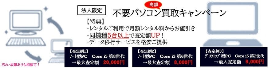 不要なパソコンの高額買取を行うキャンペーンを開始します。買取させていただいたお客様を対象に、パソコン処分に伴うデータ消去・移行サービスを特別価格でご提供。レンタルパソコンの長期(24ヵ月・2年以上)ご契約のお客様にはレンタル料の割引も行います。故障や汚れがある場合も、まずはお気軽にお問い合わせください。