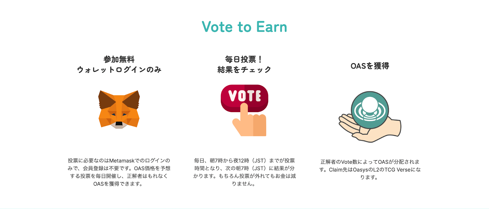 Oasysチェーンのバリデーター報酬を原資としているため、ユーザーにサステナブルに OAS を配布することが可能です。また、CryptoGamesへOASをステーキングすると投票数が増え、報酬が増加します。受け取るべきステーキング報酬も毀損しない為、ユーザーに喪失は発生しません。